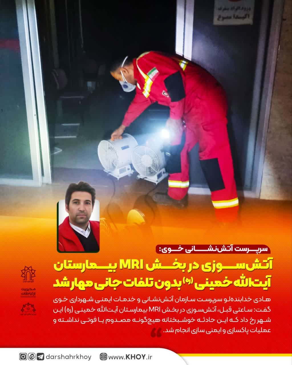 به گزارش اداره ارتباطات شورای اسلامی شهر و شهرداری خوی، خدابنده لو در تشریح جزئیات این حادثه اظهار داشت: بنابر گزارش اولیه، آتشسوزی در بخش MRI بیمارستان آیتالله امام خمینی (ره) خوی اتفاق افتاده بود که خوشبختانه پیش از رسیدن نیروهای آتشنشانی، با اقدام به موقع و شجاعانه پرسنل زحمتکش بیمارستان مهار شده بود.