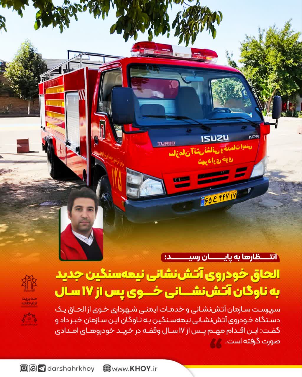 وی ادامه داد: این خودرو در ایستگاه تازه تأسیس شماره پنج آتشنشانی خوی مستقر شده و آماده ارائه خدمات امداد و اطفای حریق به شهروندان گرانقدر خویی خواهد بود.