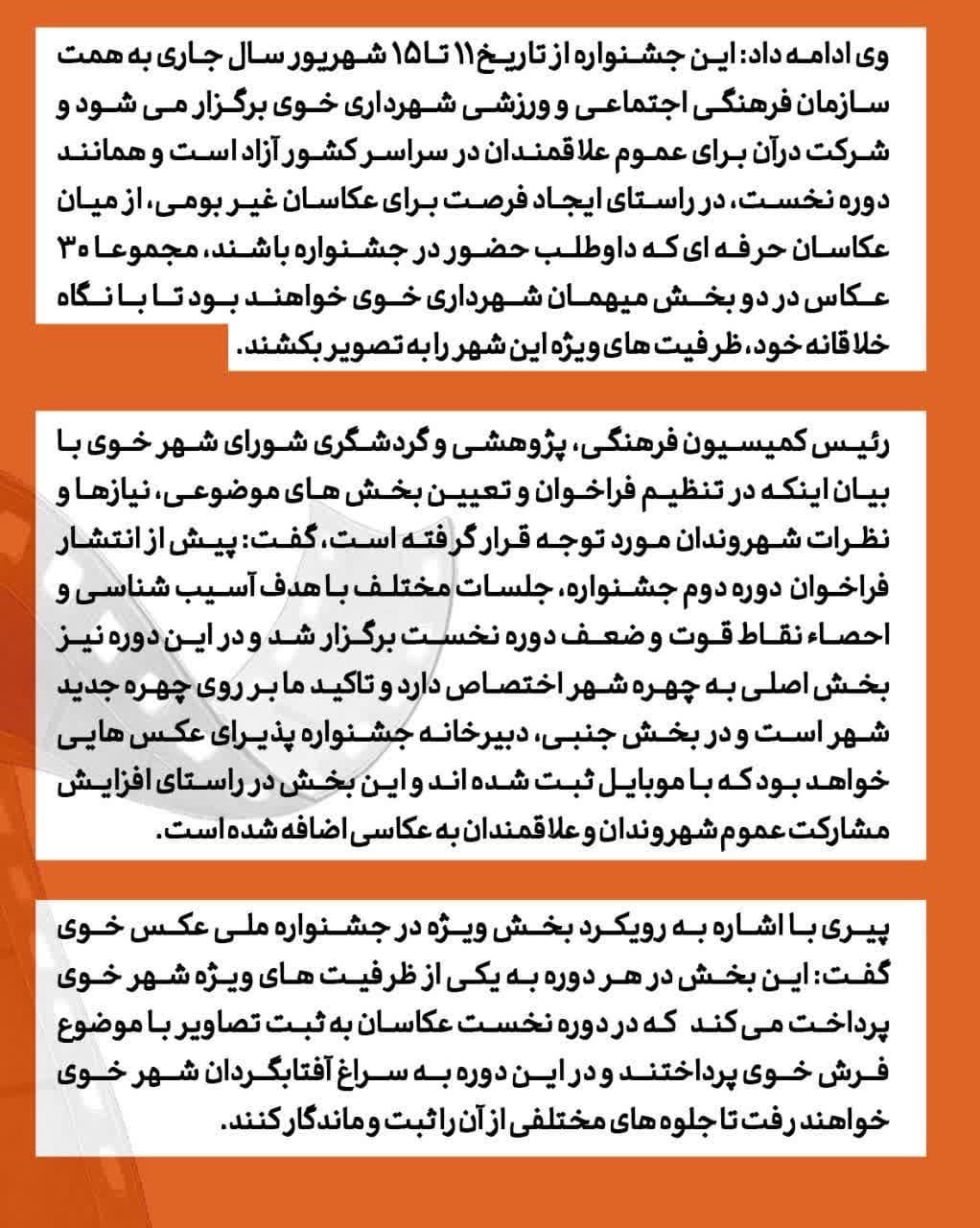 رئیس کمیسیون فرهنگی، پژوهشی و گردشگری شورای شهر خوی با بیان اینکه در تنظیم فراخوان و تعیین بخش های موضوعی، نیازها و نظرات شهروندان مورد توجه قرار گرفته است، گفت: پیش از آغاز رسمی دوره دوم جشنواره، جلسات مختلف با هدف آسیب شناسی و احصا نقاط قوت و ضعف دوره نخست این جشنواره برگزار شد و در این دوره نیز بخش اصلی به چهره شهر اختصاص دارد و تاکید ما بر روی چهره جدید شهر است و در بخش جنبی، دبیرخانه جشنواره پذیرای عکس هایی خواهد بود که با موبایل ثبت شده اند و این بخش در راستای افزایش مشارکت عموم شهروندان و علاقمندان به عکاسی اضافه شده است.