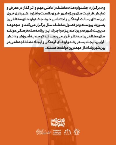 وی، برگزاری جشنواره های مختلف را عاملی مهم و اثر گذار در معرفی و نمایش ظرفیت های ویژه شهر خوی دانست و افزود: شهرداری خوی در راستای رسالت فرهنگی و اجتماعی خود، جشنواره های مختلفی را بصورت پیوسته و در فصول مختلف سال برگزار می کند و مجموعه مدیریت شهری در برنامه ریزی و اجرای این برنامه های فرهنگی مولفه های مختلفی را مد نظر قرار می دهد که در این خصوص توجه به آموزش و دانش افزایی، ایجاد بستر رشد و ارتقای فرهنگی و ایجاد نشاط اجتماعی در بین شهروندان، از مهمترین مولفه ها در این زمینه هستند.