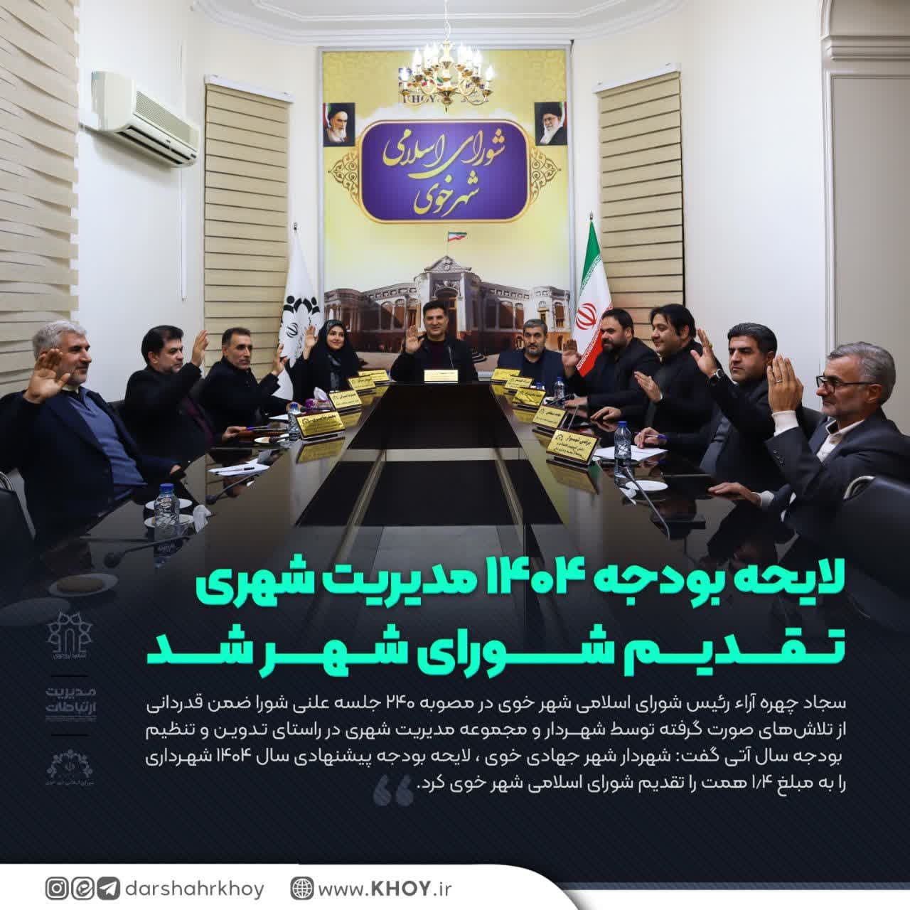رئیس شورای اسلامی شهر خوی در پایان افزود: جزئیات این بودجه در کمیسیون های شورای اسلامی شهر خوی بررسی خواهد شد و موظف هستیم تا پایان بهمن بودجه را جهت اجرا به تصویب برسانیم.
