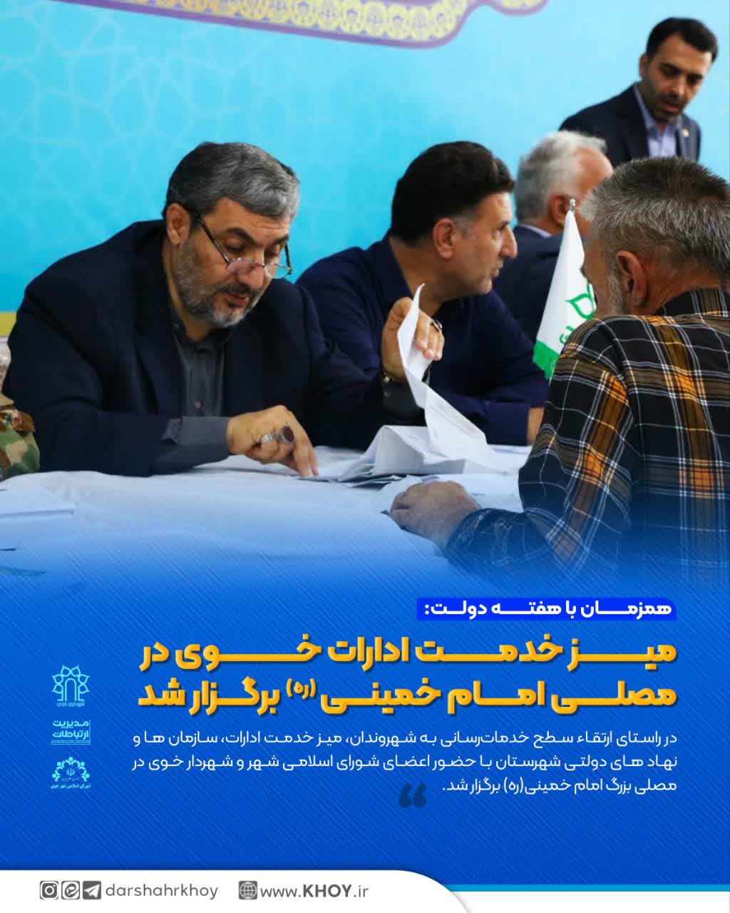 به گزارش اداره ارتباطات شورای اسلامی شهر و شهرداری خوی، این میز خدمت، شامل بخشهای مختلف اداری، فرهنگی، عمرانی و خدمات شهری بود که هدف از آن، تسهیل فرآیندهای اداری و پاسخگویی سریع به نیازهای مردم است.