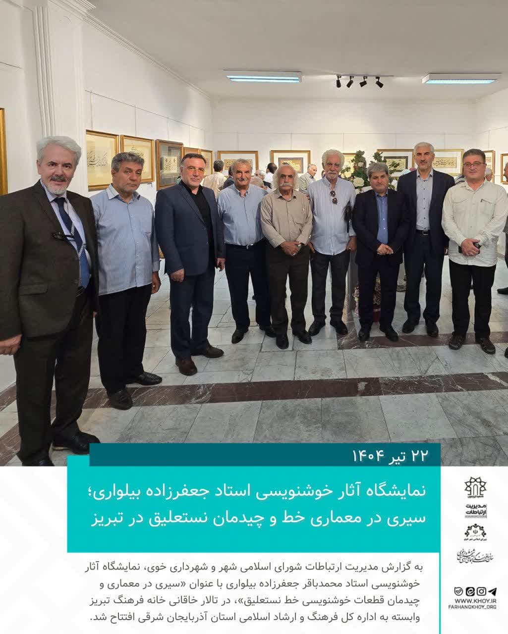 به گزارش مدیریت ارتباطات شورای اسلامی شهر و شهرداری خوی، نمایشگاه آثار خوشنویسی استاد محمدباقر جعفرزاده بیلواری با عنوان «سیری در معماری و چیدمان قطعات خوشنویسی خط نستعلیق»، در تالار خاقانی خانه فرهنگ تبریز وابسته به اداره کل فرهنگ و ارشاد اسلامی استان آذربایجان شرقی افتتاح شد.