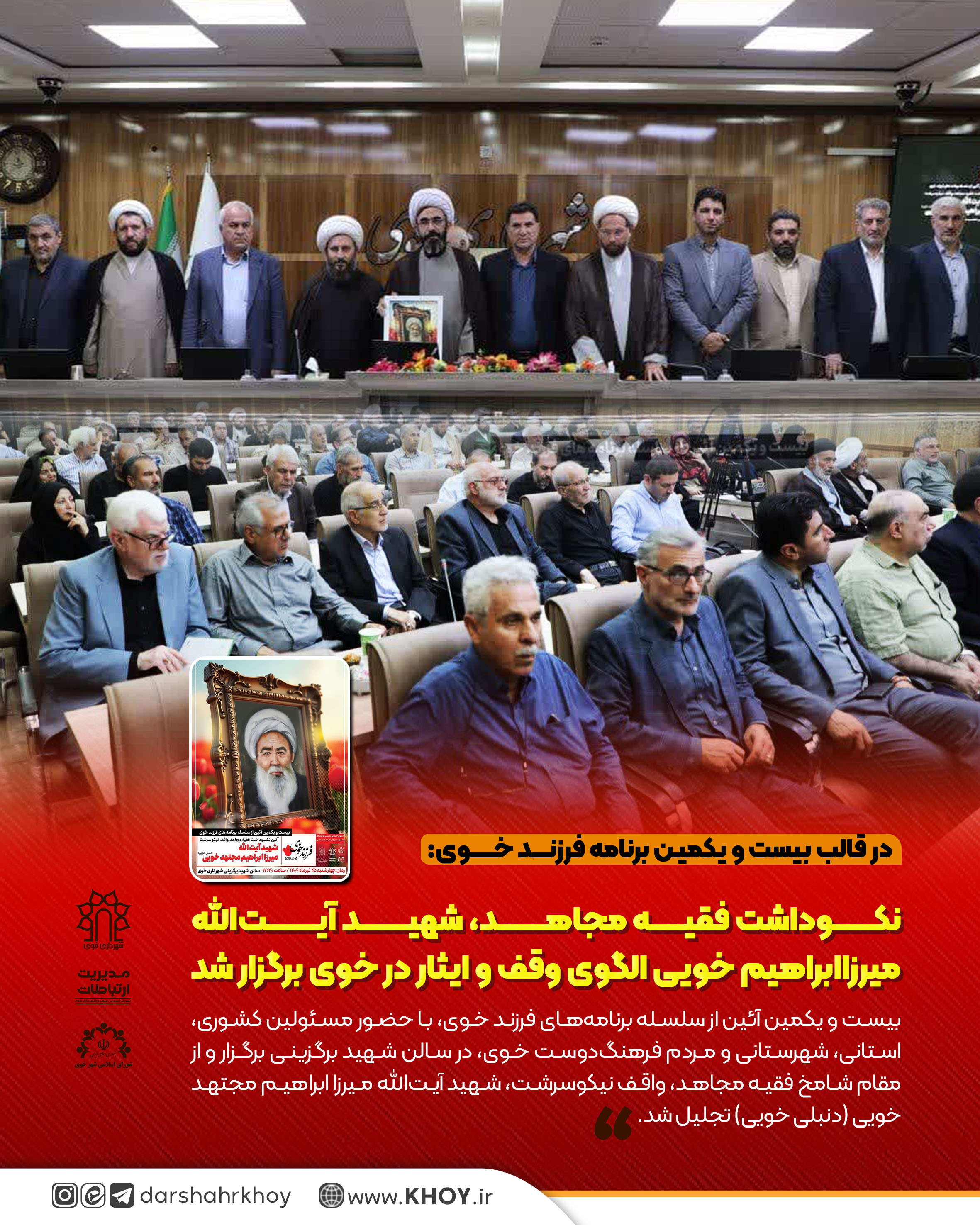 به گزارش مدیریت ارتباطات شورای اسلامی شهر و شهرداری خوی، بیست و یکمین آئین از سلسله برنامههای فرزند خوی، با حضور مسئولین کشوری، استانی، شهرستانی و مردم فرهنگدوست خوی، در سالن شهید برگزینی برگزار و از مقام شامخ فقیه مجاهد، واقف نیکوسرشت، شهید آیتالله میرزا ابراهیم مجتهد خویی (دنبلی خویی) تجلیل شد.