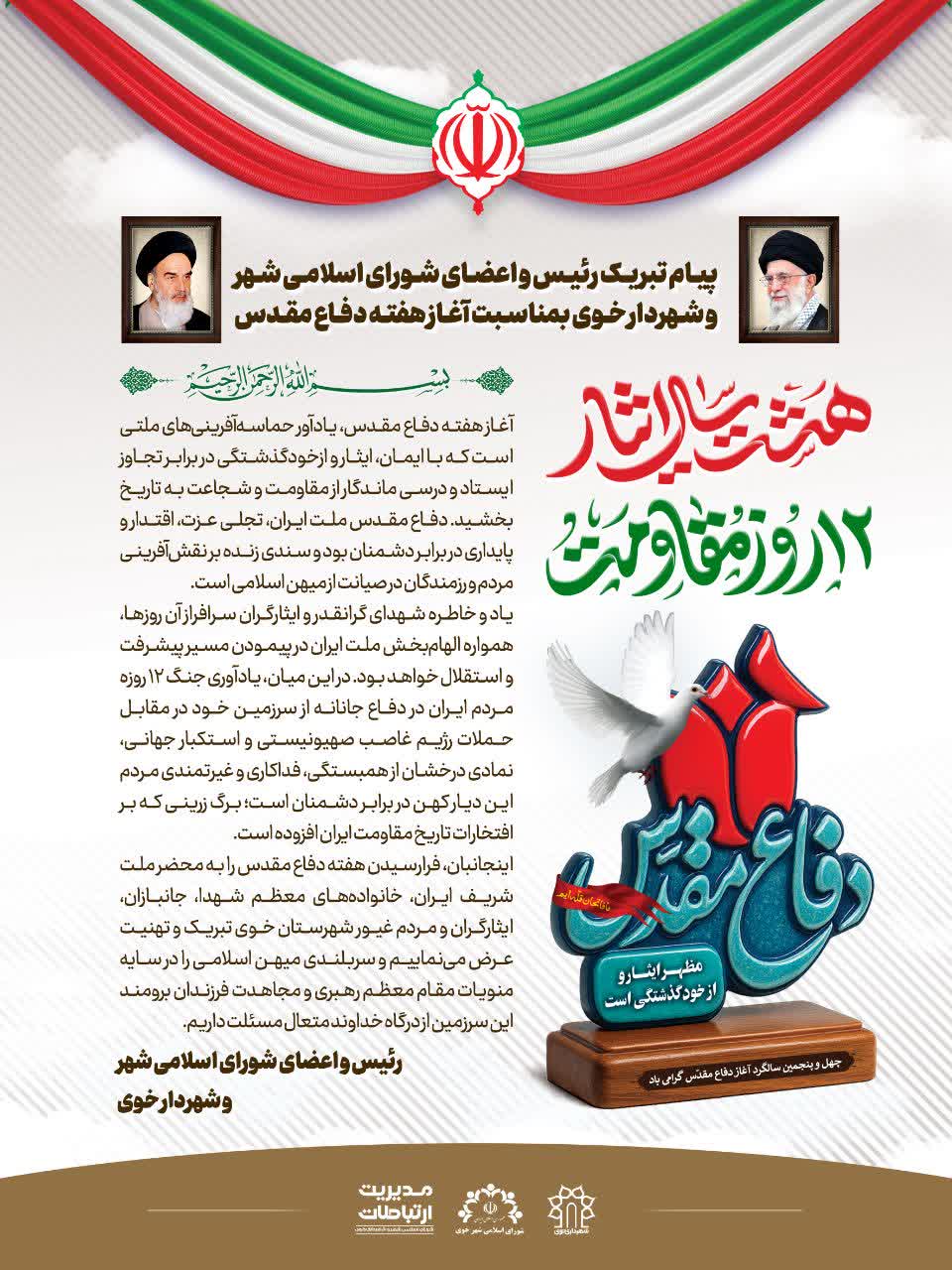 اینجانبان، فرارسیدن هفته دفاع مقدس را به محضر ملت شریف ایران، خانوادههای معظم شهدا، جانبازان، ایثارگران و مردم غیور شهرستان خوی تبریک و تهنیت عرض مینماییم و سربلندی میهن اسلامی را در سایه منویات مقام معظم رهبری و مجاهدت فرزندان برومند این سرزمین از درگاه خداوند متعال مسئلت داریم.