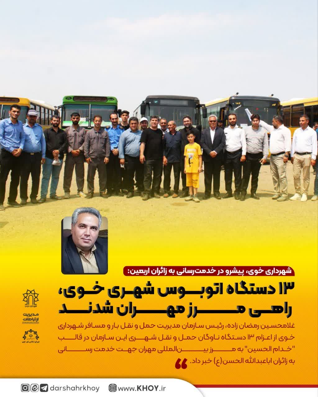 به گزارش اداره ارتباطات شورای اسلامی شهر و شهرداری خوی، رمضان زاده با اشاره به جزئیات این خبر افزود: این ناوگان شامل ۱۳ دستگاه اتوبوس شهری کاملاً آماده و بازبینیشده است که وظیفه خطیر جابجایی زائران از شهر و پارکینگهای مهران تا پایانه بینالمللی را بر عهده خواهند داشت.